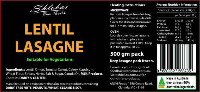 Lentil, Onion, Tomato, Carrot, Celery, Capsicum, Wheat Flour, Spices, Herbs, Salt & Sugar, Canola Oil, Milk Products. Contains DAIRY & GLUTEN.