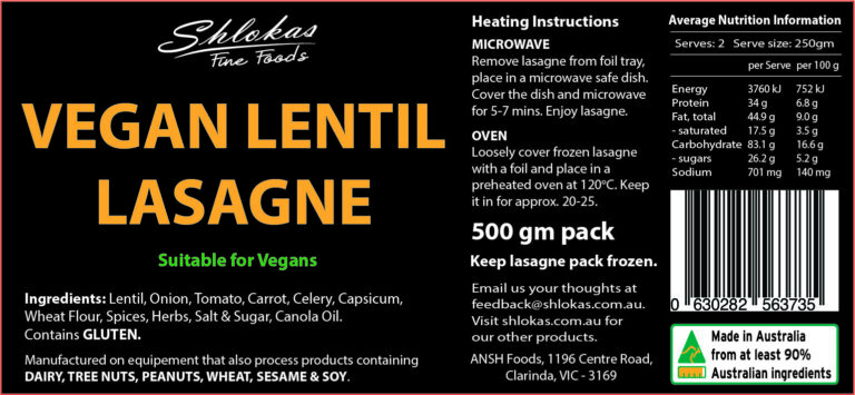 Lentil, Onion, Tomato, Carrot, Celery, Capsicum, Wheat Flour, Spices, Herbs, Salt & Sugar, Canola Oil. Contains GLUTEN.