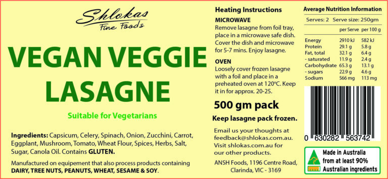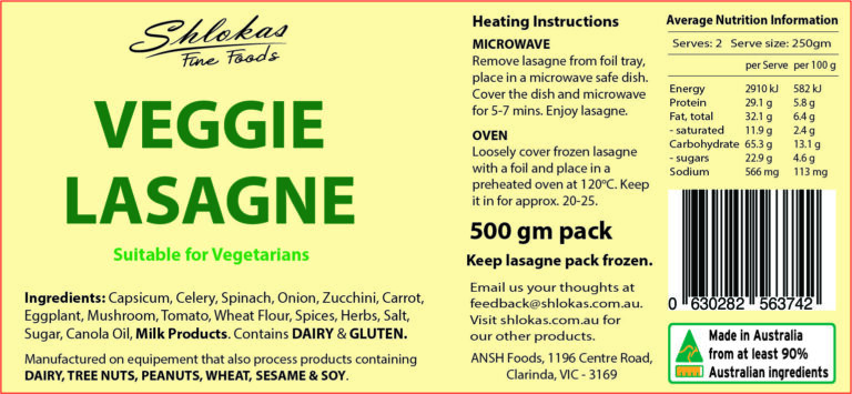 Capsicum, Celery, Spinach, Onion, Zucchini, Carrot, Eggplant, Mushroom, Tomato, Wheat Flour, Spices, Herbs, Salt & Sugar, Canola Oil, Milk Products. Contains DAIRY & GLUTEN.